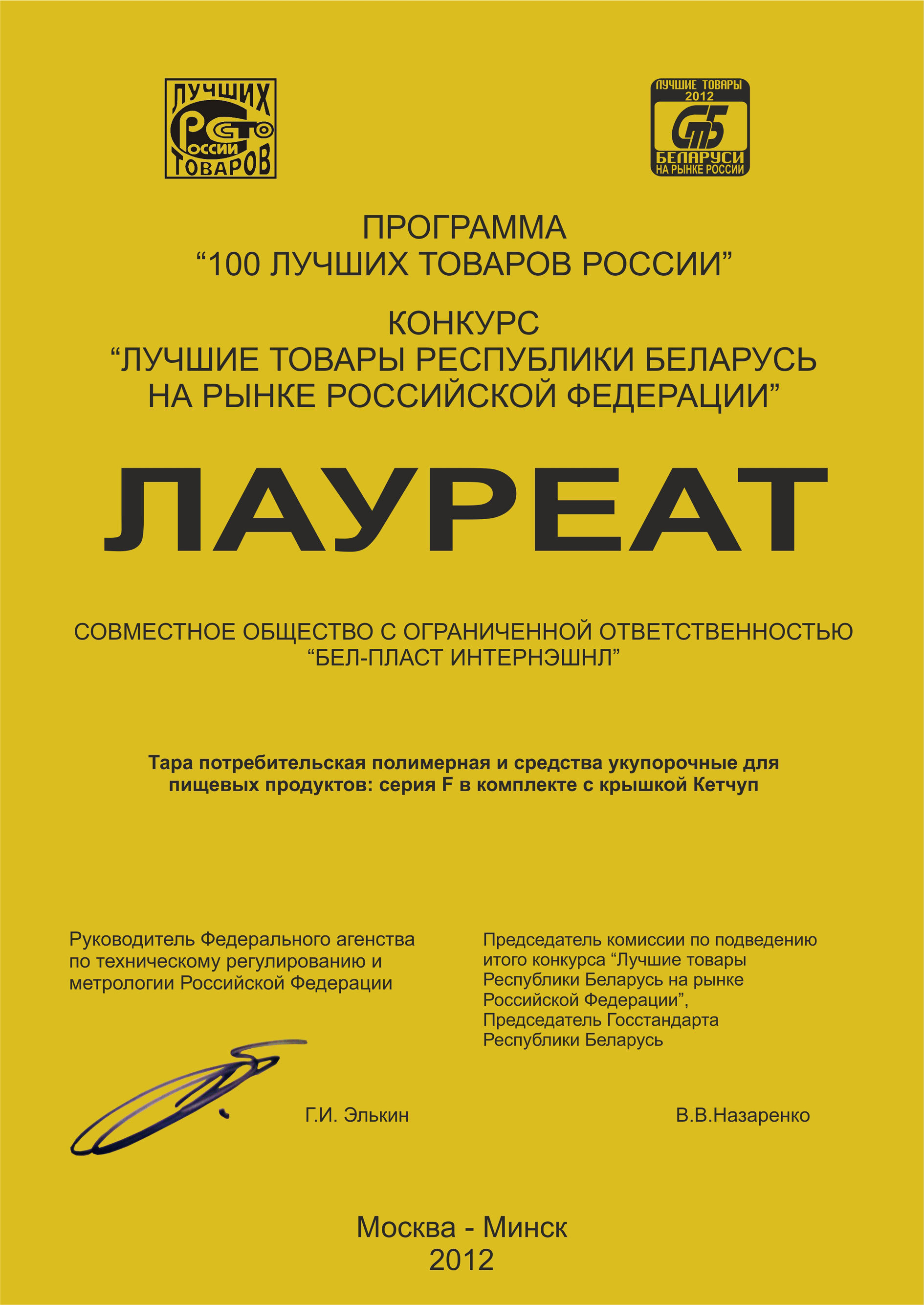 29.08.2012 the products of JC “Bel-Plast International” Ltd. consumer packaging polymer and closures for foodstuffs series F with the cap Ketchup was awarded with the diploma of laureate of the competition “The best goods of the Republic of Belarus on the market of Russian Federation”.