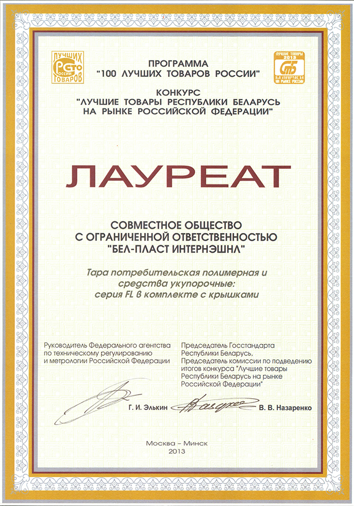23.10.2013 the products of JC “Bel-Plast International” Ltd. consumer packaging polymer and closures series FL with caps was awarded with the diploma of laureate of the competition “The best goods of the Republic of Belarus on the market of Russian Federation”.