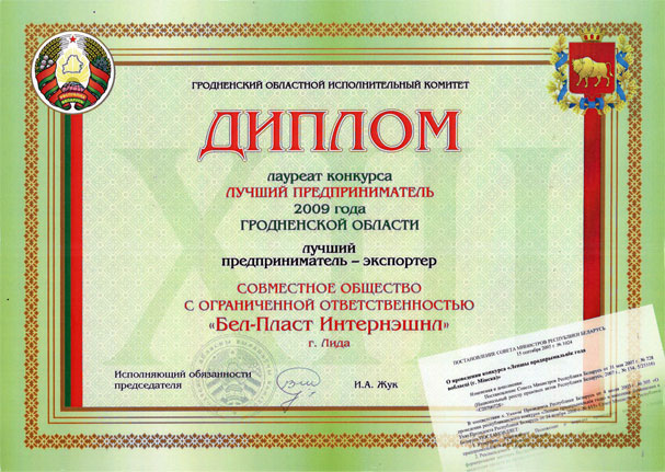 26 марта 2010 года состоялась торжественная церемония награждения победителей и лауреатов конкурса «Лучший предприниматель 2009 года» Гродненской области. СООО "Бел-Пласт Интернэшнл" награжден дипломом лаурета в номинации "Лучший предприниматель-экспортер"