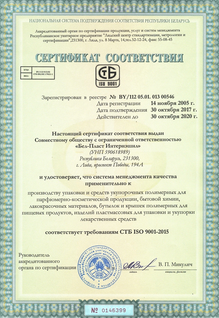 21.09.2017 органом по сертификации систем управления РУП "Лидский ЦСМС" в СООО "Бел-Пласт Интернэшнл" был проведен сертификационный аудит на подтверждение системы менеджмента качества требованиям стандарта СТБ ISO 9001-2015. В результате чего предприятию выдан сертификат соответствия до 30 октября 2020 года.