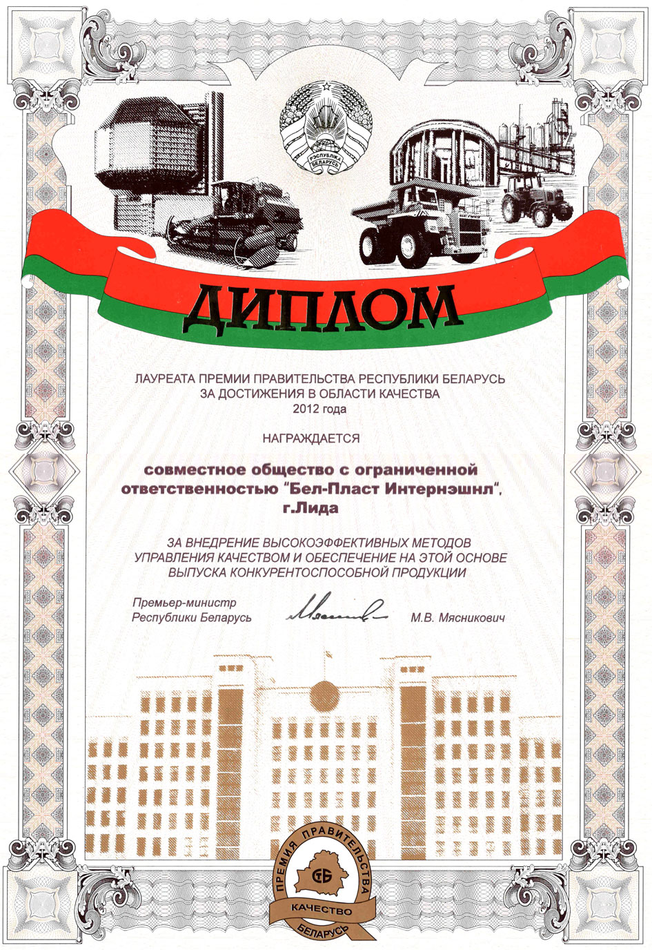 СООО "Бел-Пласт Интернэшнл" в 2012 году подтвердило звание Лауреата Премии Правительства за достижения в области качества.