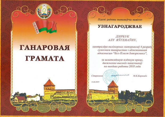 За многолетний добросовестный труд и достижение высоких показателей в работе Почетной грамотой Лидского районного исполнительного комитета награждена контролер полимерных материалов 4 разряда СООО «Бел-Пласт Интернэшнл» Дирбук Алла Евгеньевна.