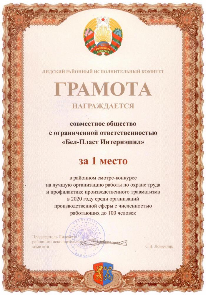 СООО «Бел-Пласт Интернэшнл» заняло первое место в районном смотре-конкурсе на лучшую организацию работы по охране труда и профилактике производственного травматизма в 2020 году среди организаций производственной сферы с численностью работающих до 100 человек.