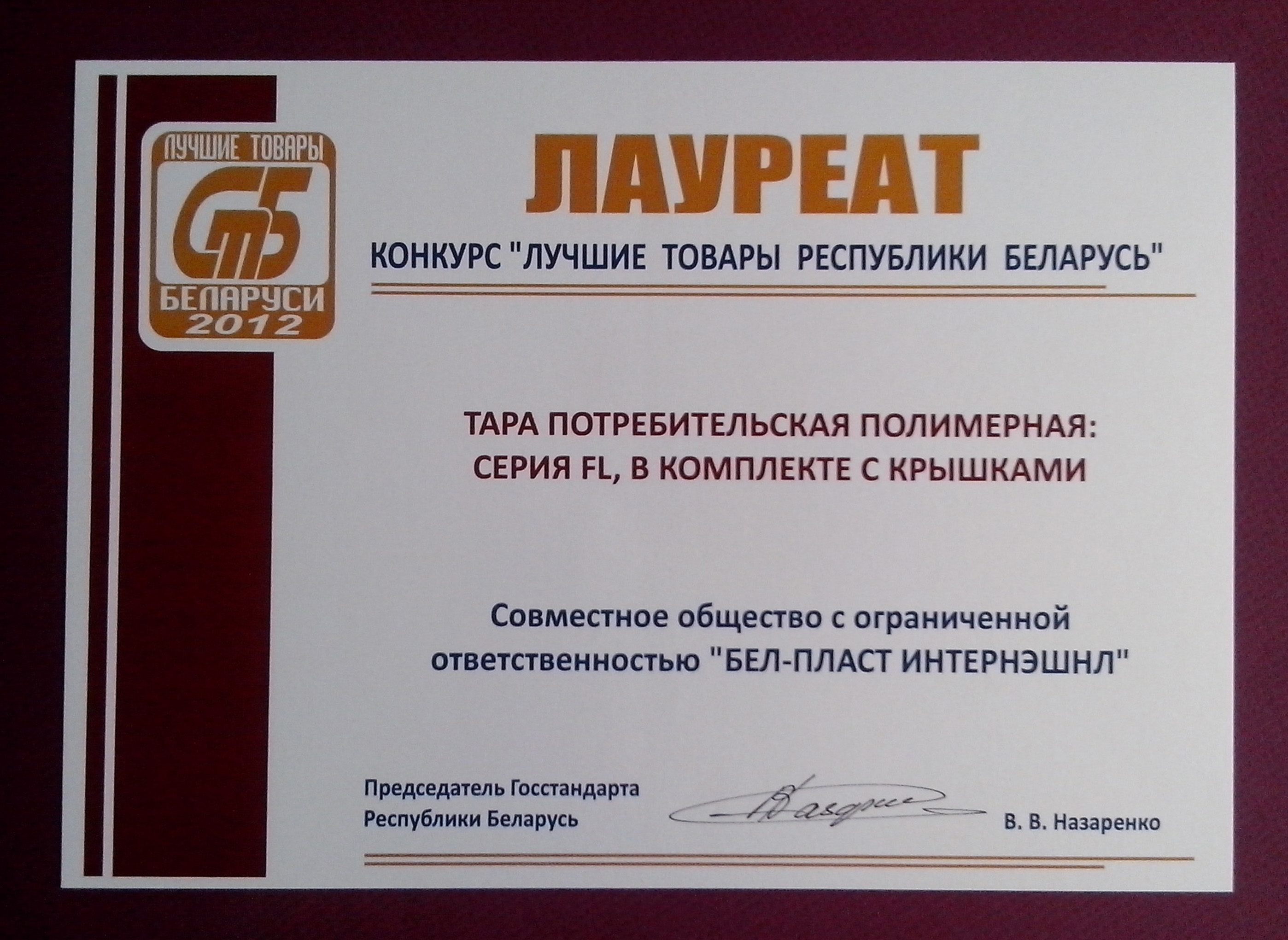 29.03.2013 года продукция производства СООО "Бел-Пласт Интернэшнл" - тара полимерная потребительская серия FL в комплекте с крышками награждена дипломом Лауреата конкурса "Лучшие товары Республики Беларусь". СООО "Бел-Пласт Интернэшнл" является Лауреатом конкурса Лучшие товары Республики Беларусь на протяжении 10-ти лет (с 2003 по 2012 года).