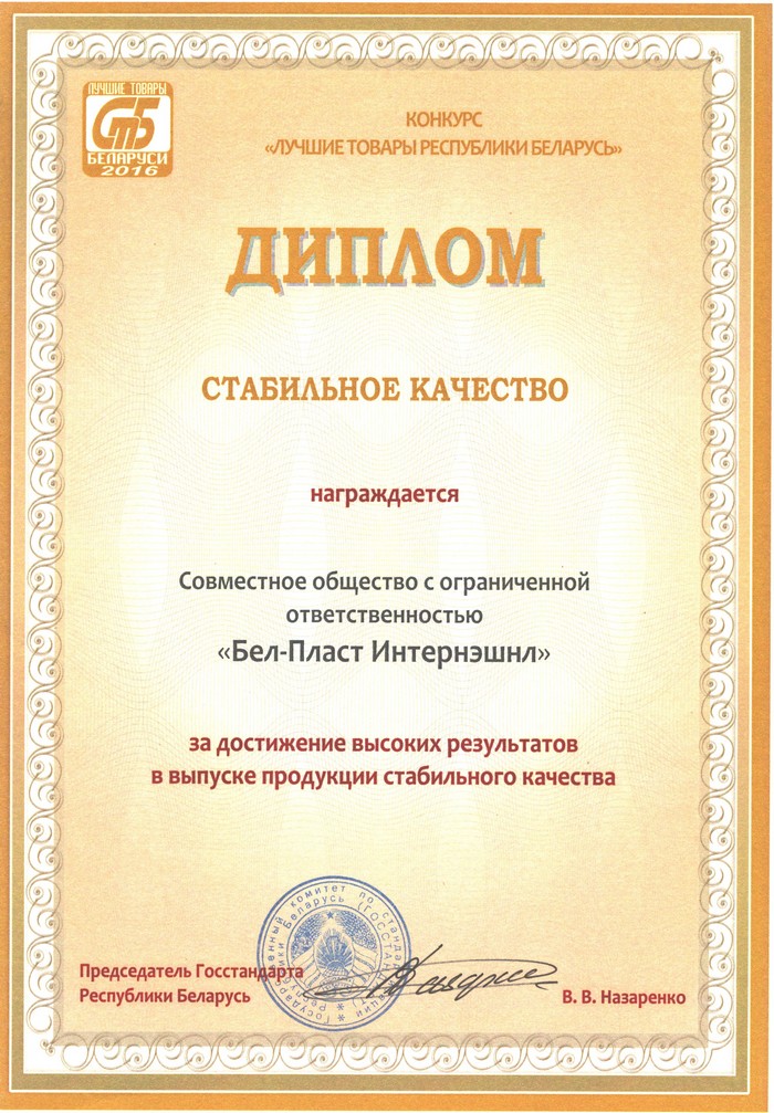По решению республиканской конкурсной комиссии за подтверждение должного качества продукции СООО «Бел-Пласт Интернэшнл» удостоено специальной награды конкурса - диплома «Стабильное качество».